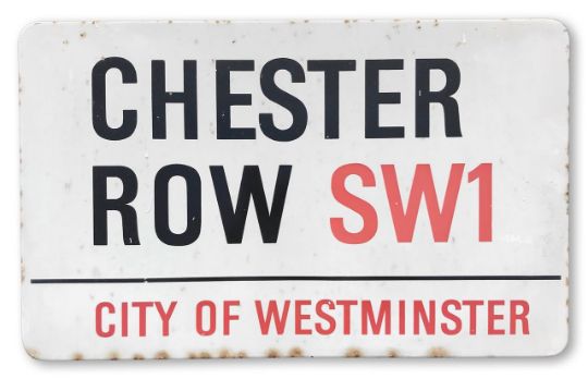 An enamelled iron street sign for Chester Row SW1, City of Westminster, with iconic and black and red sans serif lettering first created by Sir Misha Black in 1967 which is unique to the Westminster signs and under copyright law, forbidden to be copied anywhere else in the world, sold together with a signed Certificate of Authenticity