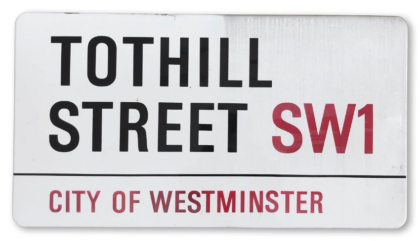 An enamelled iron street sign for Tothill Street SW1, City of Westminster, with iconic and black and red sans serif lettering first created by Sir Misha Black in 1967 which is unique to the Westminster signs and under copyright law, forbidden to be copied anywhere else in the world, sold together with a signed Certificate of Authenticity