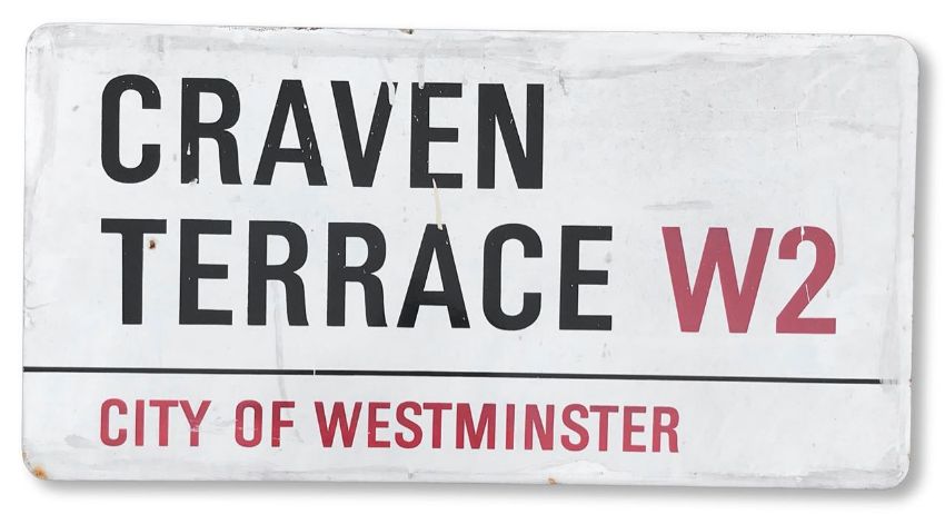 An enamelled iron street sign for Craven Terrace W2, City of Westminster, with iconic and black and red sans serif lettering first created by Sir Misha Black in 1967 which is unique to the Westminster signs and under copyright law, forbidden to be copied anywhere else in the world, sold together with a signed Certificate of Authenticity