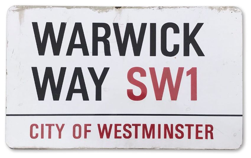 An enamelled iron street sign for Warwick Way SW1, City of Westminster with iconic black and red sans serif lettering first created by Sir Misha Black in 1967 which is unique to the Westminster signs and under copyright law, forbidden to be copied anywhere else in the world, sold together with a signed Certificate of Authenticity