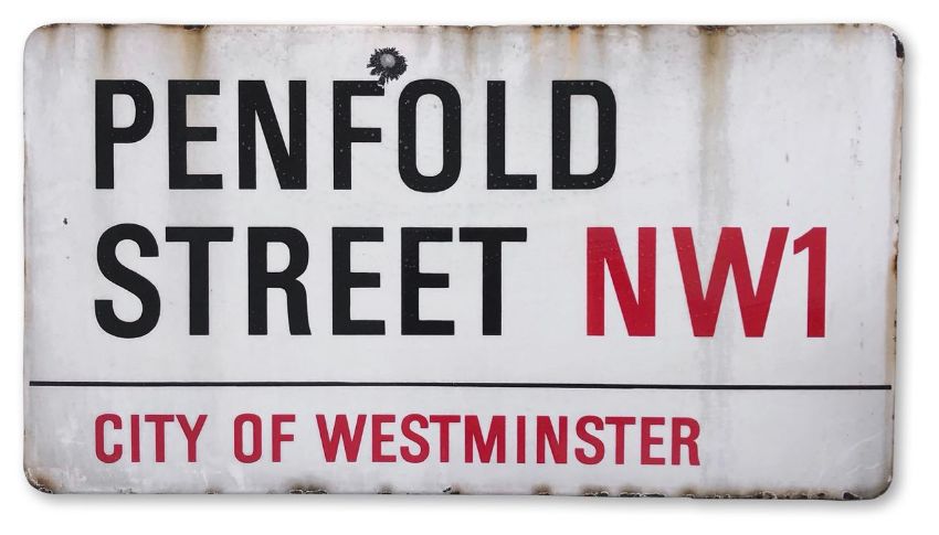 An enamelled iron street sign for Penfold Street NW1, City of Westminster, on wooden frame to back, with iconic and black and red sans serif lettering first created by Sir Misha Black in 1967 which is unique to the Westminster signs and under copyright law, forbidden to be copied anywhere else in the world, sold together with a signed Certificate of Authenticity