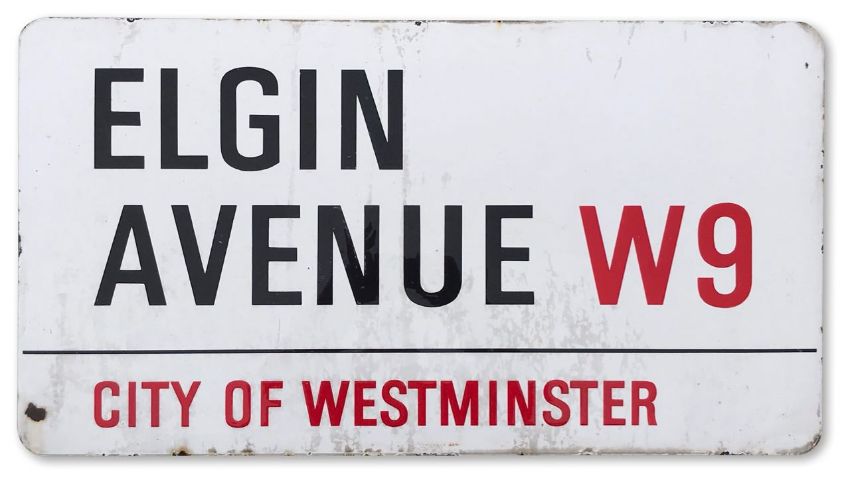 An enamelled iron street sign for Elgin Avenue W9, City of Westminster with iconic black and red sans serif lettering first created by Sir Misha Black in 1967 which is unique to the Westminster signs and under copyright law, forbidden to be copied anywhere else in the world, sold together with a signed Certificate of Authenticity