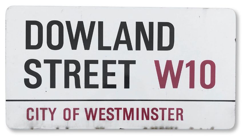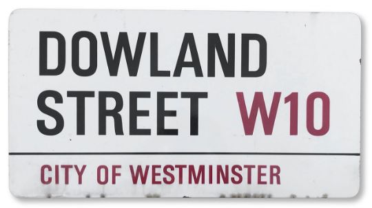 An enamelled iron street sign for Dowland Street W10, City of Westminster, with iconic and black and red sans serif lettering first created by Sir Misha Black in 1967 which is unique to the Westminster signs and under copyright law, forbidden to be copied anywhere else in the world, sold together with a signed Certificate of Authenticity