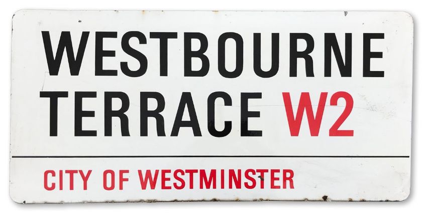 An enamelled iron street sign for Westbourne Terrace W2, City of Westminster on part wooden frame, with iconic black and red sans serif lettering first created by Sir Misha Black in 1967 which is unique to the Westminster signs and under copyright law, forbidden to be copied anywhere else in the world, sold together with a signed Certificate of Authenticity