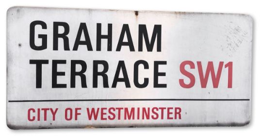 An enamelled iron street sign for Graham Terrace SW1, City of Westminster, on wooden frame to back, with iconic and black and red sans serif lettering first created by Sir Misha Black in 1967 which is unique to the Westminster signs and under copyright law, forbidden to be copied anywhere else in the world, sold together with a signed Certificate of Authenticity