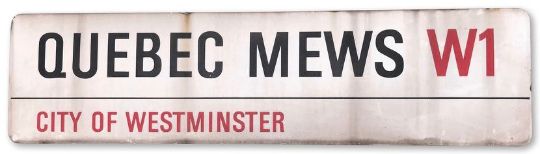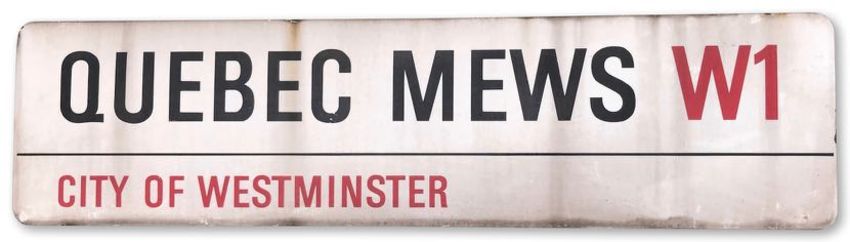 An enamelled iron street sign for Quebec Mews W1, City of Westminster, with iconic black and red sans serif lettering first created by Sir Misha Black in 1967 which is unique to the Westminster signs and under copyright law, forbidden to be copied anywhere else in the world, sold together with a signed Certificate of Authenticity
