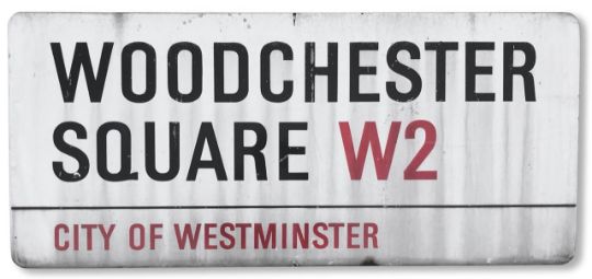 An enamelled iron street sign for Woodchester Square W2, City of Westminster, with iconic and black and red sans serif lettering first created by Sir Misha Black in 1967 which is unique to the Westminster signs and under copyright law, forbidden to be copied anywhere else in the world, sold together with a signed Certificate of Authenticity