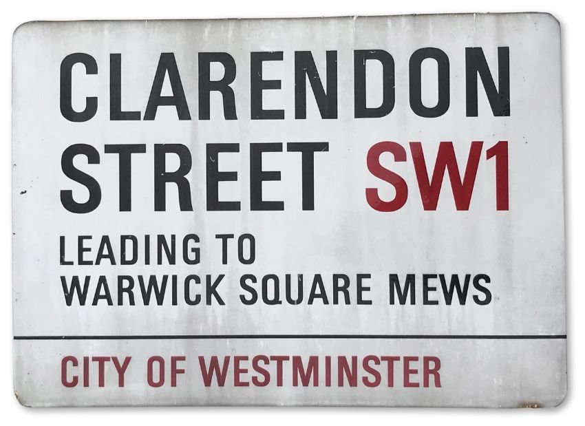 An enamelled iron street sign for Clarendon Street SW1 leading to Warwick Square Mews, City of Westminster with iconic black and red sans serif lettering first created by Sir Misha Black in 1967 which is unique to the Westminster signs and under copyright law, forbidden to be copied anywhere else in the world, sold together with a signed Certificate of Authenticity