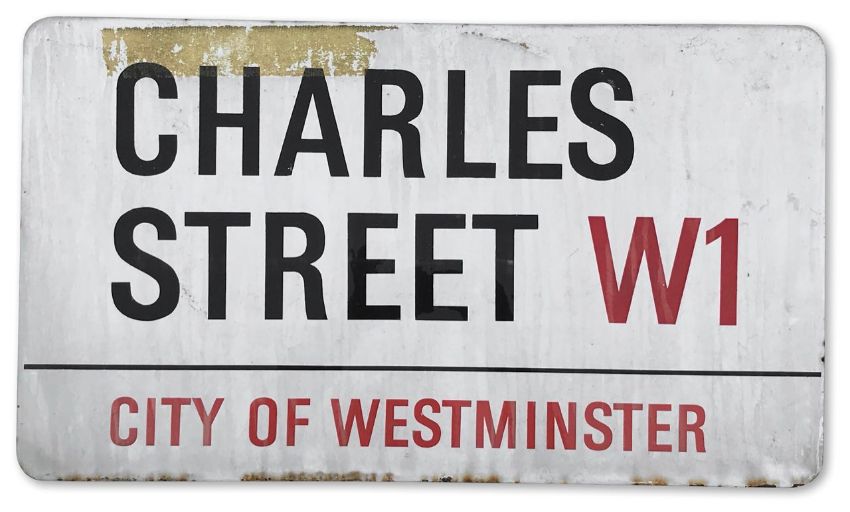 An enamelled iron street sign for Charles Street W1, City of Westminster with iconic black and red sans serif lettering first created by Sir Misha Black in 1967 which is unique to the Westminster signs and under copyright law, forbidden to be copied anywhere else in the world, sold together with a signed Certificate of Authenticity