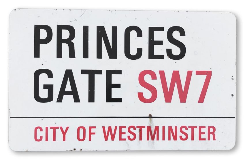 An enamelled iron street sign for Princes Gate SW7, City of Westminster, with iconic and black and red sans serif lettering first created by Sir Misha Black in 1967 which is unique to the Westminster signs and under copyright law, forbidden to be copied anywhere else in the world, sold together with a signed Certificate of Authenticity