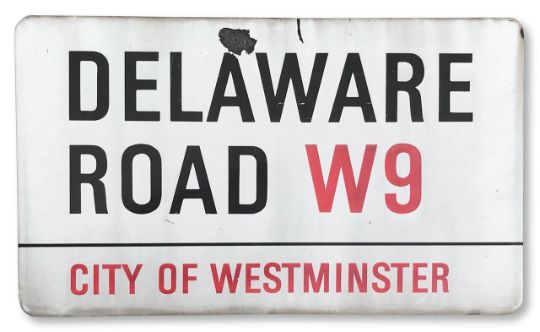 An enamelled iron street sign for Delaware Road W9, City of Westminster, with iconic and black and red sans serif lettering first created by Sir Misha Black in 1967 which is unique to the Westminster signs and under copyright law, forbidden to be copied anywhere else in the world, sold together with a signed Certificate of Authenticity