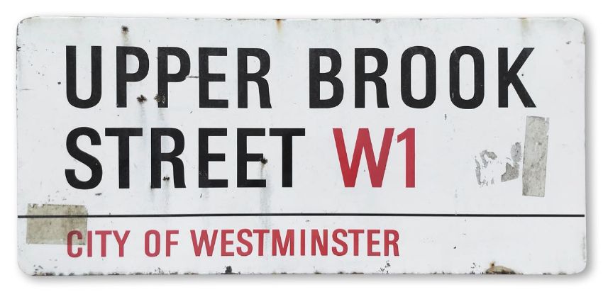 An enamelled iron street sign for Upper Brook Street W1, City of Westminster, with iconic and black and red sans serif lettering first created by Sir Misha Black in 1967 which is unique to the Westminster signs and under copyright law, forbidden to be copied anywhere else in the world, sold together with a signed Certificate of Authenticity