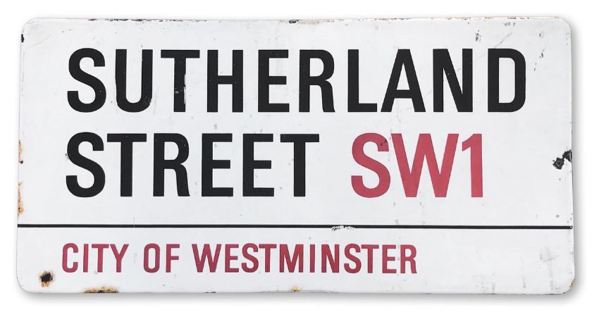 An enamelled iron street sign for Sutherland Street SW1, City of Westminster, with iconic black and red sans serif lettering first created by Sir Misha Black in 1967 which is unique to the Westminster signs and under copyright law, forbidden to be copied anywhere else in the world, sold together with a signed Certificate of Authenticity