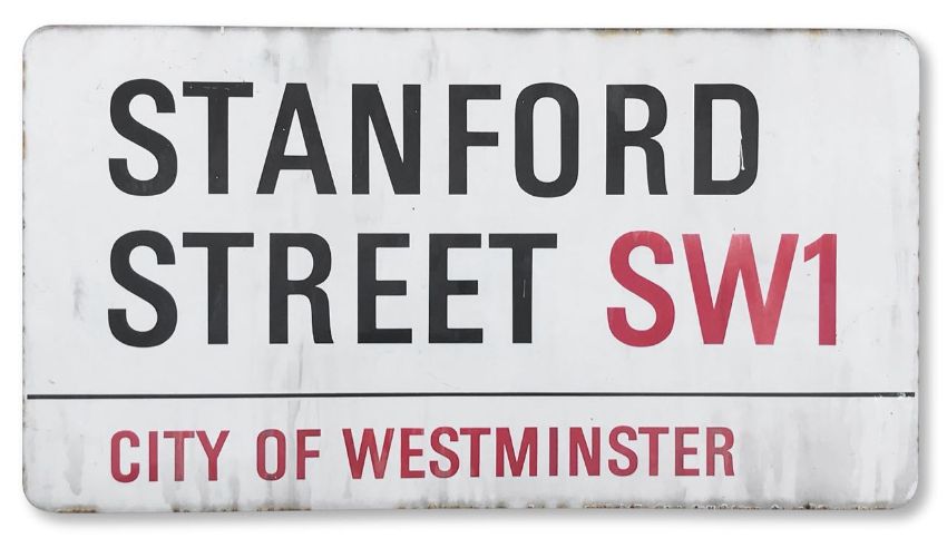 An enamelled iron street sign for Stanford Street SW1, City of Westminster, with iconic and black and red sans serif lettering first created by Sir Misha Black in 1967 which is unique to the Westminster signs and under copyright law, forbidden to be copied anywhere else in the world, sold together with a signed Certificate of Authenticity