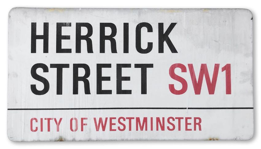An enamelled iron street sign for Herrick Street SW1, City of Westminster, with iconic and black and red sans serif lettering first created by Sir Misha Black in 1967 which is unique to the Westminster signs and under copyright law, forbidden to be copied anywhere else in the world, sold together with a signed Certificate of Authenticity