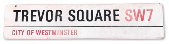 An enamelled iron street sign for Trevor Square SW7, City of Westminster, with iconic black and red sans serif lettering first created by Sir Misha Black in 1967 which is unique to the Westminster signs and under copyright law, forbidden to be copied anywhere else in the world, sold together with a signed Certificate of Authenticity