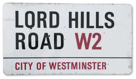 An enamelled iron street sign for Lord Hills Road W2, City of Westminster on part wooden frame, with iconic black and red sans serif lettering first created by Sir Misha Black in 1967 which is unique to the Westminster signs and under copyright law, forbidden to be copied anywhere else in the world, sold together with a signed Certificate of Authenticity