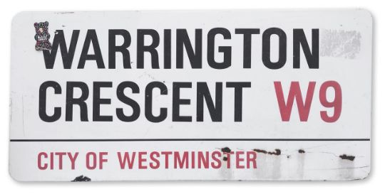 An enamelled iron street sign for Warrington Crescent W9, City of Westminster, with iconic and black and red sans serif lettering first created by Sir Misha Black in 1967 which is unique to the Westminster signs and under copyright law, forbidden to be copied anywhere else in the world, sold together with a signed Certificate of Authenticity