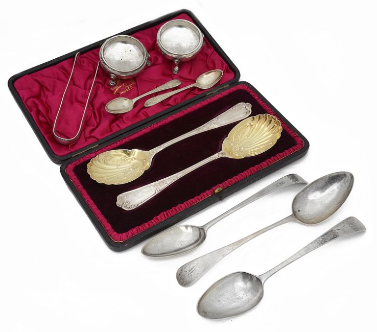 comprising a pair of plain cauldron salts, London, 1759 by Walter Brind, raised on stepped pad feet, a pair of Old English pattern tablespoons, London, 1782 by Joseph Steward II, initialled, another tablespoon, pair of bright cut engraved sugar tongs, lion passant and makers mark only by George Burrows, a cased pair of fancy serving spoons, Sheffield, 1901 by Mappin and Webb, having gilt scalloped bowls, and a pair of Irish Victorian bright cut engraved Celtic point coffee spoons, (qty)