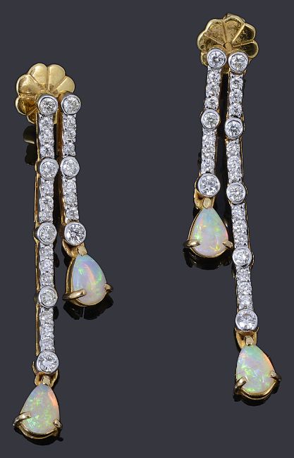 A pair of opal and diamond ear pendants, each designed a two articulated asymmetric rows of brilliant-cut diamonds each with a pendeloque cabochon opal terminal,maximum length approx: 4 cmCondition:Approximate total spread weight of diamonds:  0.80ct-0.90ctsCombined total weight 8.1 grammes approximatelyall four opals well matched and face up with better play of colour than in the photograph