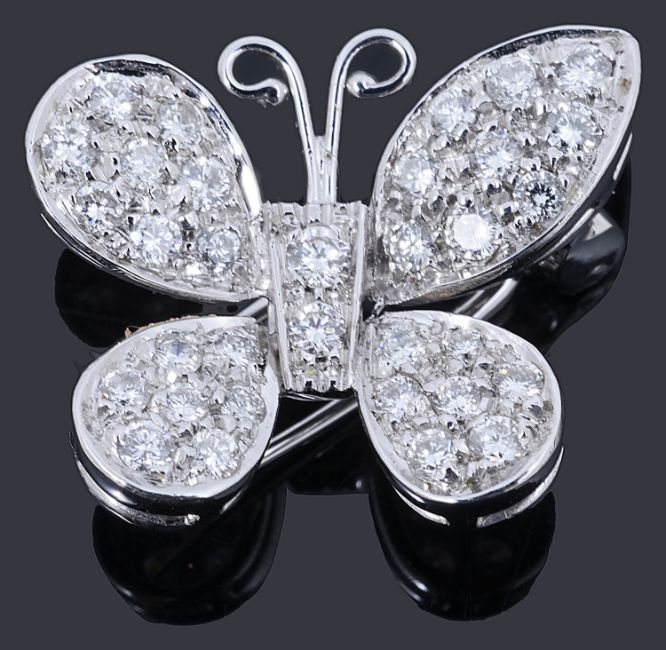 brilliant cut diamonds, claw set to the body and wings of the butterfly, with a two pin fitting to the reverse, markers marks T set within a triangle