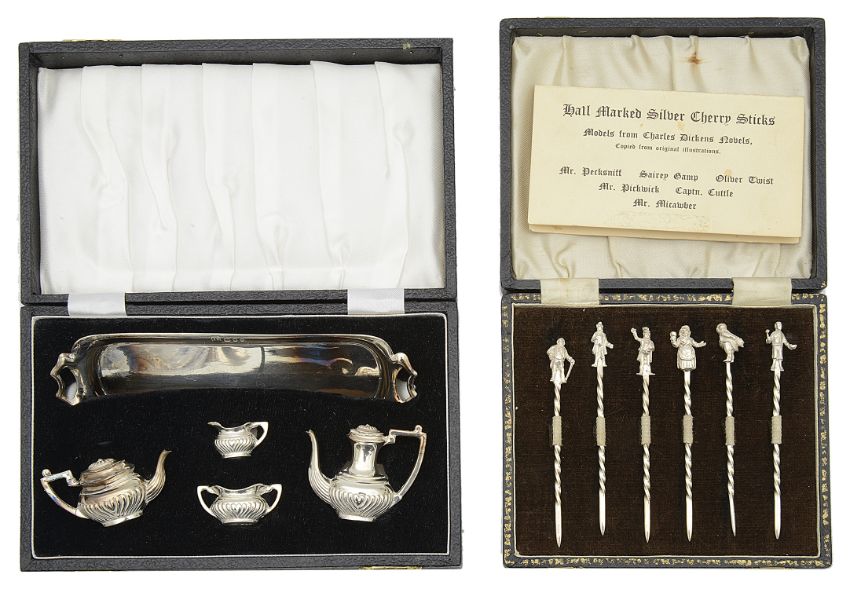 A modern novelty miniature silver five piece tea service and a set of six Charles Dickens character cocktail sticks