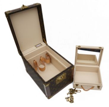 trimmed in brown studded leather, the brass clasp stamped 'LV', the lock plate stamped '1090476' with key, internal sticker no. '1983685' opens to reveal a fitted removable mirrored box sitting to the top section, below with three leather hoops, with key