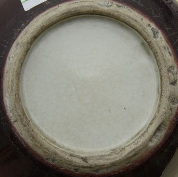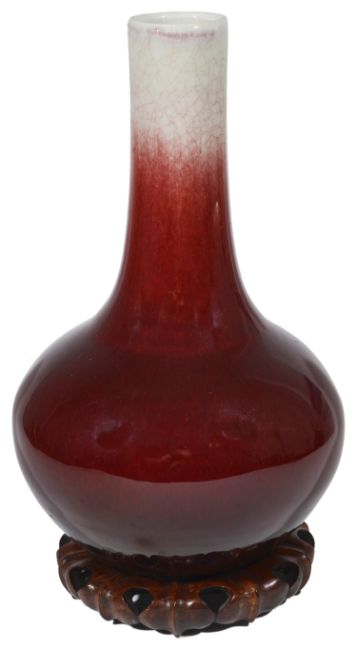A large late 19th/early 20th century Chinese sang de beouf glazed bottle vaseon a carved hardwood standheight 33.5 cm, height on stand 36.5 cm.Condition: Good condition, some wear / scratches to glaze near base Private collection of Charles Butterfield, Attorney General, Singapore 1955-1957 and thence by direct descent