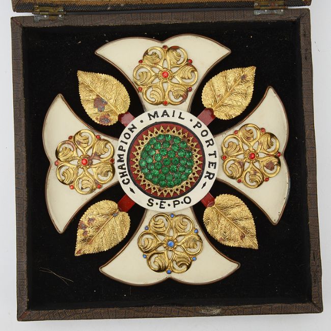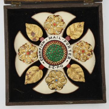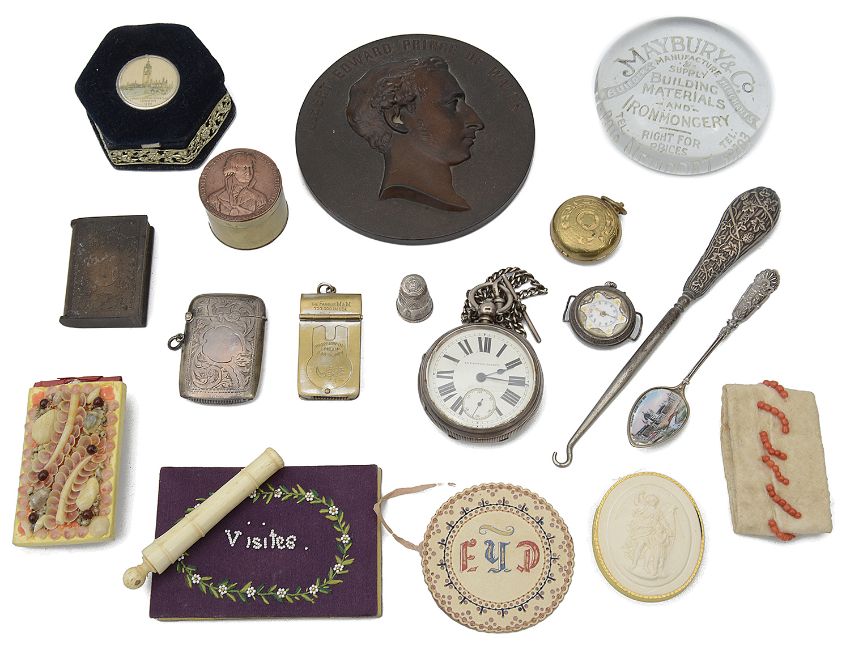 comprising a J Maybury & Co Builders Merchants Newport Advertising paperweight; a large Champion Mail Porter S.E.P.O gilt metal, enamel paste set prize badge, cased; a foliate engraved silver vesta vas; silver open faced pocket watch having fusee movement numbered 8648 and signed Joseph Wolfe Sunderland with silver curb link Albert watch chain, a .800 silver and enamel picture bowl Glasgow Exhibition 1901 souvenir coffee spoon; a Nelson Battle of The Nile coin set brass counter box; a brass sovereign case; a hexagonal gilt metal mounted Franco British-Exhibition London 1908 trinket box; a bois durci plaque of Albert Edward Prince of Wales; a Grand Tour plaster cameo; a turned bone needle case with Souvenir of Towyn, Wales stanhope etc, (qty)