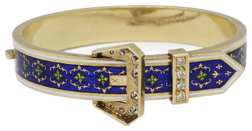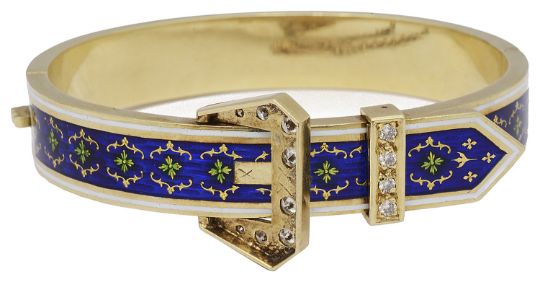 having blue guilloche enamel set with green and gold floral and scroll decoration, with a white enamel banding to the outer edge, a graduated brilliant cut diamonds set buckle and diamond set 'loop' bar, concealed clasp and safety chain, in fitted box