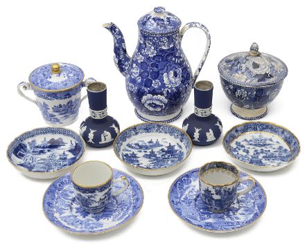 comprising Wedgwood pearlware blue and white transfer decorated pear shaped coffee pot and a covered sugar basin, c.1835 both impressed Wedgwood, a Spode 'Willow' type twin handle chocolate pot and cover on stand, an additional stand, a pair of Adams dark blue Japserware bottle vases, impressed Adams, Tunstall and two late 18th Chinese blue and white export coffee cups and three saucers with gilt rims, (qty)