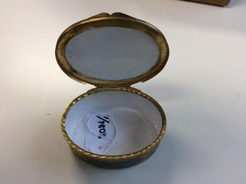 A late 18th Century gilt metal mounted oval enamel table box