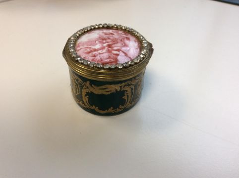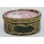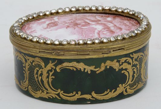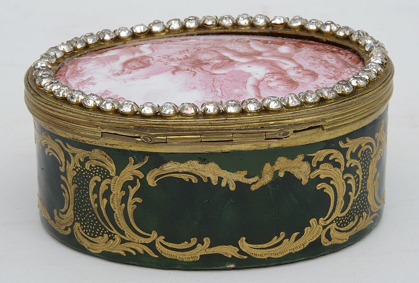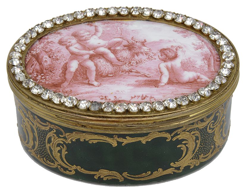 the hinged lid finely painted after a design by Piat Sauvage (Belgian 1744-1818) with putti playing with a goat in a sylvan landscape within a paste set border, the green guilloche enamel sides decorated with gilt scrolls