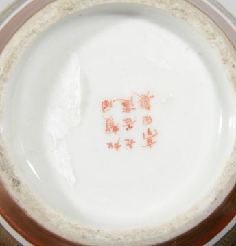 of ovoid form decorated with panels of geisha girls, immortals and landscape scenes surrounded by gilt stylised floral decoration, with nine character iron-red painted marks to base, (2)