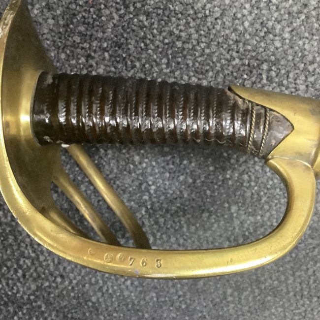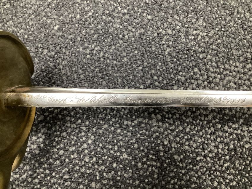 the 39.5 inch fullered blade, engraved to spine 'Mre Impale de Chatt -Janvier 1862 - Caraber Mdl 1854), leather covered grip and brass hilt, numbered 763 L 48