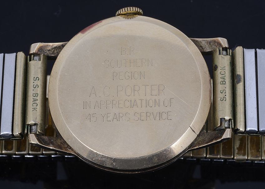 Arabic numerals, blue hands and subsidiary dial on later expanding bracelet, inscription to the reverse