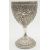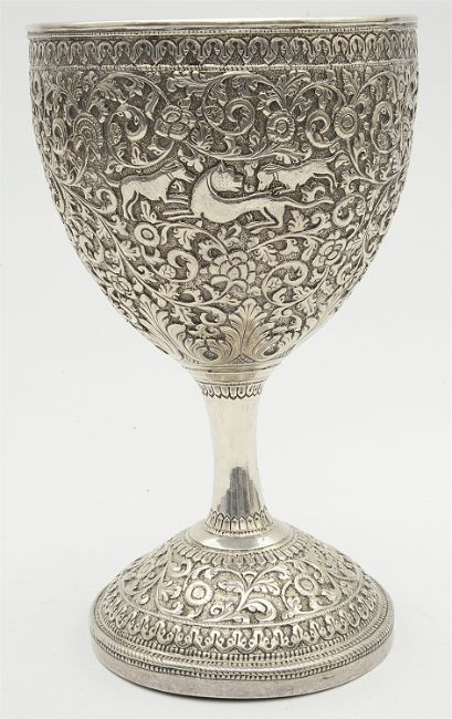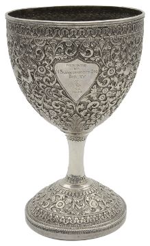 unmarked, the large tapering bowl on a domed pedestal foot, all over chased with scrolling foliate design and with a tiger hunting a stag and hunting dogs chasing a boar and a tiger, bearing a heart shaped reserve engraved 'presented by H. Blennerhasset Esq. Bisley 1926, crested