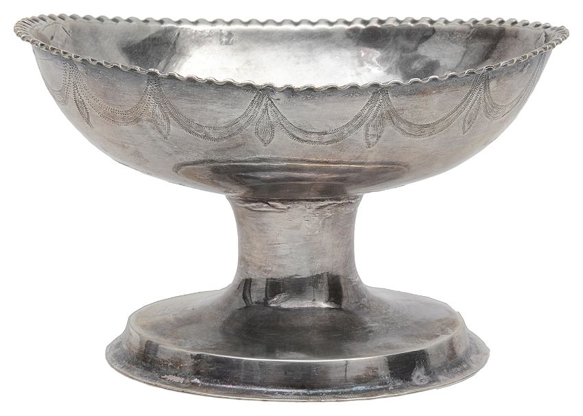 oval bowl with crimped rim engraved with swags to sides and a flower to centre on oval foot