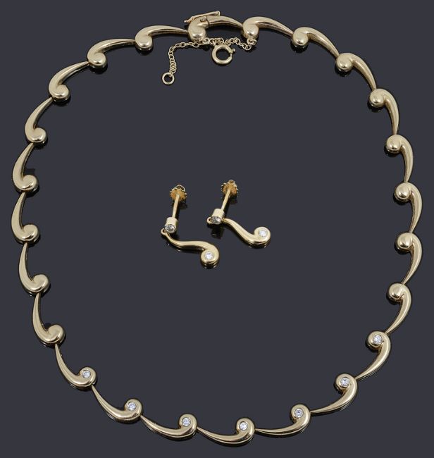 the necklace of articulated attenuated 'C' scroll link design, the seven front links each set with a brilliant-cut diamond, to the concealed clasp and safety chain; each ear pendant set with a brilliant-cut diamond and with a diamond set collet surmount