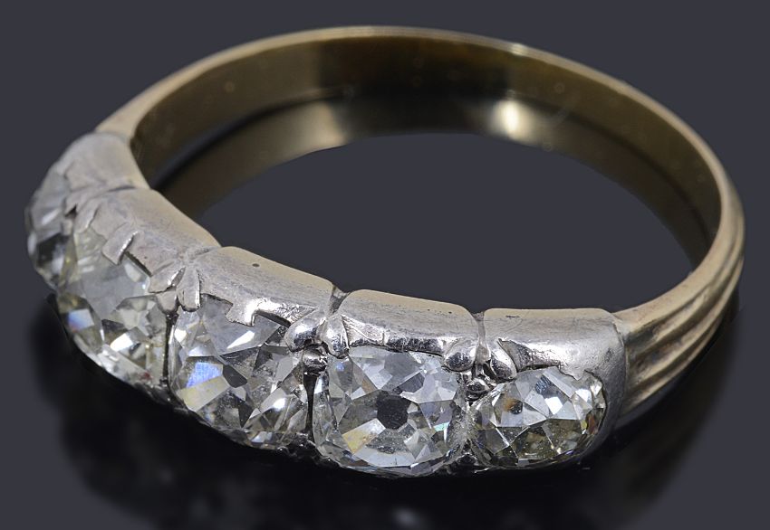 A early 19th century graduated cushion-shaped old brilliant cut diamond five stone ring, the central diamond estimated to weigh 0.60 cts approximately to the silver floral spacers and blocked gallery and yellow gold reeded shank