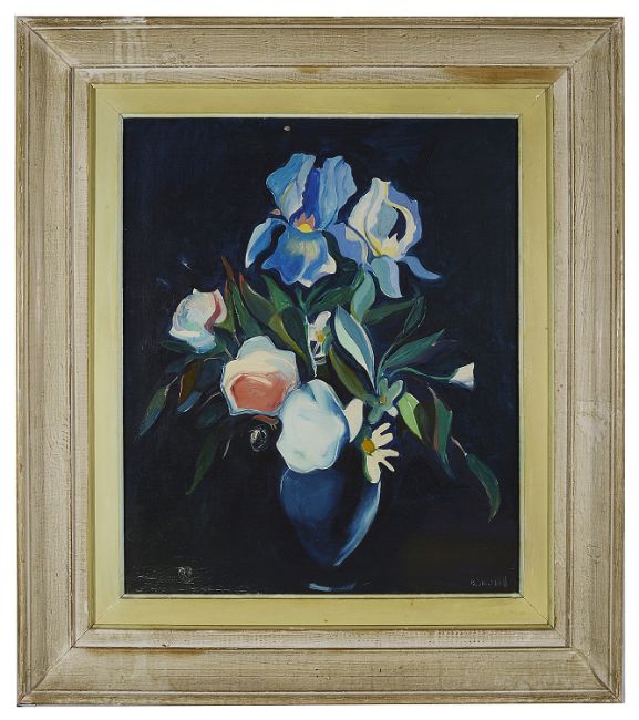 'Still life study of a vase of irises and roses', oil on canvas, signed bottom right, framed