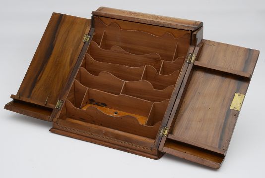 Condition: Interior divvsions with cracks, small losses and repairs. Slight chip to right corner of hinged top. Right hand slight has warped and is pulling away from side so there is no a gap beween to the two halves of the sloped fron