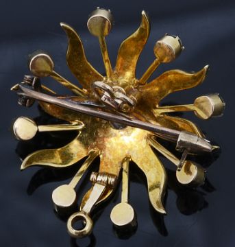A Victorian diamond and split pearl star burst broocha central old European cut diamond in a cut down collet, to a star burst design, all set with graduated split pearls and further split pearls in cut down collets to tapering knife bars, with a detachable brooch and pendant setting to the reversetotal weight approx: 10.0gCondition: Central diamond estimated measurements 3.72 x 3.89 x 2.57 mm total diamond weight: 0.25ct, tested as approx 18ct gold