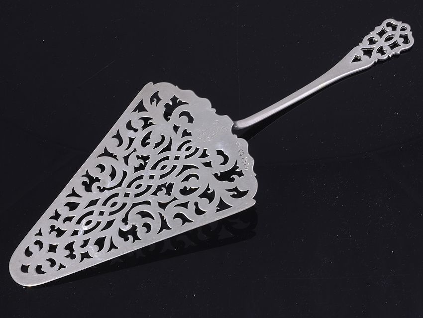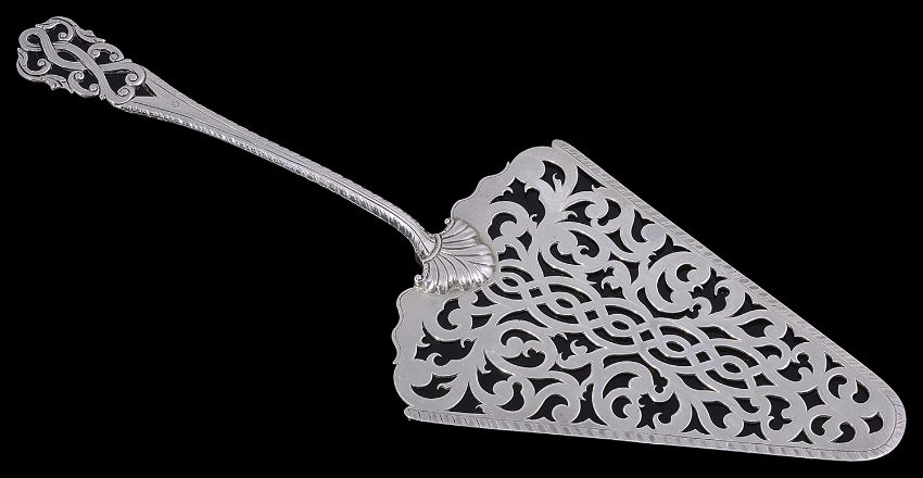the triangular blade pierced with foliate scroll decoration and having feather edge border and handle with pierced terminal, crested, the blade engraved with a later initials to reverse