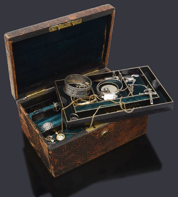A jewellery box containing a collection of gold and costume jewellery