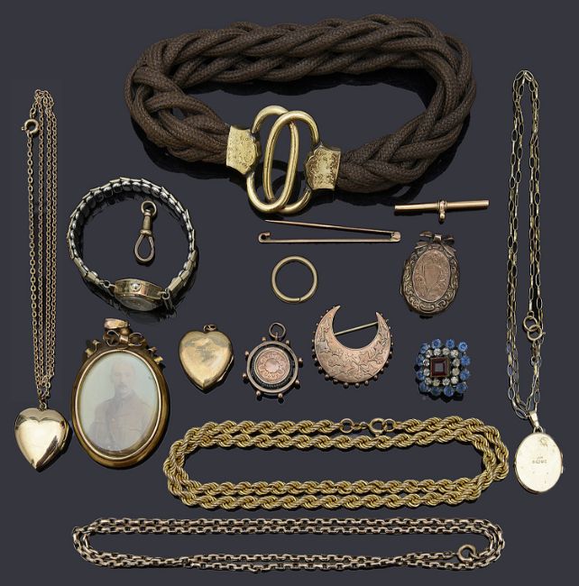 to include a 9ct gold rope chain necklace, a Victorian gold belcher chain with applied tag marked 9c, a gold picture locket with bow detail bale marked 9ct, a Victorian 9ct gold crescent brooch, a 9ct gold locket on chain, two front and back heart shaped lockets, a paste stone brooch, a Victorian plaited hair bracelet with gold cased buckle closure, a Victorian silver hinge bangle, a 9ct gold ladies mechanical Regency watch on later expanding bracelet etc (qty)