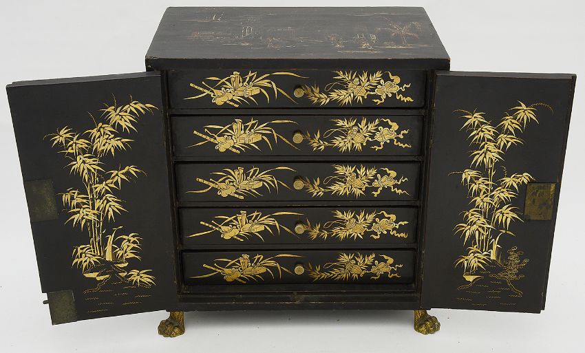 A mid 19th century Chinese export gilt decorated black lacquer table cabinet