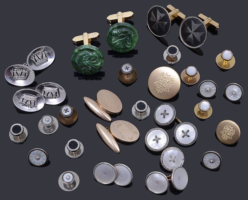 to include a pair of 9ct gold and mother of pearl chain back cufflinks (a/f), four paste, mother of pearl and black enamel buttons and a pair of matching dress studs, a pair of silver Navel crown chain back cufflinks, a pair of gold cased oval cufflinks, a pair of green hardstone carved cufflinks with gilt metal swivel fittings etc (qty)