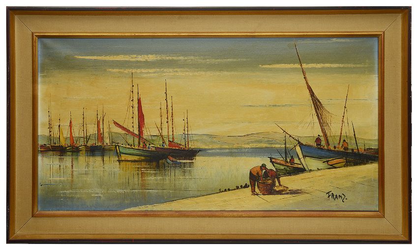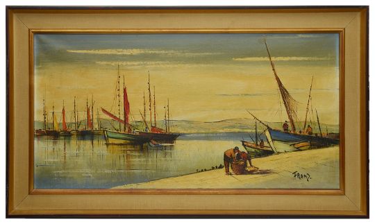 'Harbour scene with fishing boats', oil on canvas signed Franz, framed