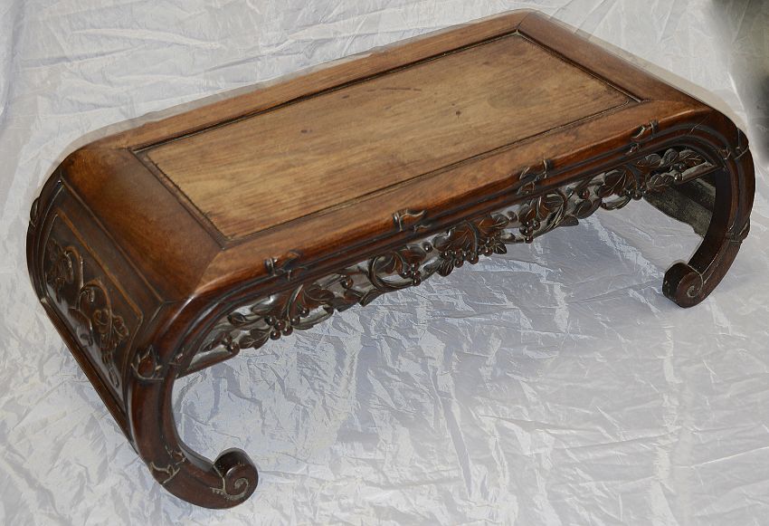 Condition: Some ring marks / stains to top. Top has some fading. Hairline crack to one end approx 17 cm long with a very small splinter loss. Terminal of one scroll foot has been repaired.